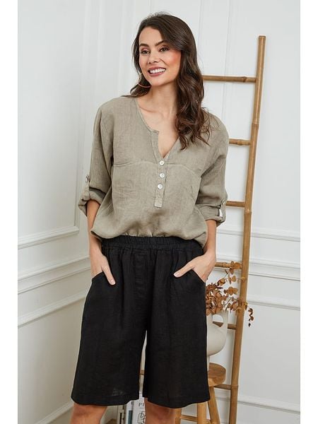 – czysty len- dekolt: z rozcięciem- zapięcie: skrócona listwa guzikowa- zakończenie rękawów: patka i guzik- krój: prosty- look: jednokolorowy