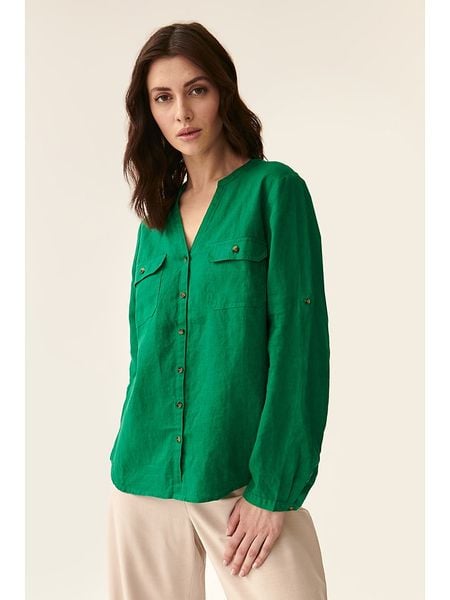 – czysty len- dekolt: z rozcięciem- zapięcie: listwa guzikowa- rękaw: bufiasty- zakończenie rękawów: guzik- kieszenie: na piersi- krój: prosty- look: jednokolorowy