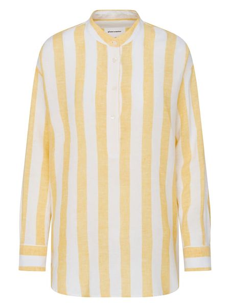 – czysty len- kołnierz: stójka- zapięcie: skrócona listwa guzikowa- zakończenie rękawów: mankiet na guzik- krój: oversized- wzór: paski