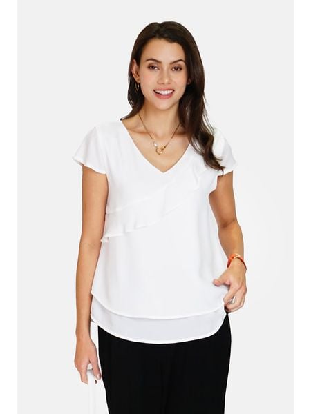 – dekolt: V- dolny brzeg: zaokrąglony – detale: falbany- krój: prosty- look: jednokolorowy, warstwyWskazówka: Na metkach odzieży tej marki znajdują się rozmiary francuskie. Rozmiarówka została przez nas przeliczona. Podane do wyboru warianty rozmiarów odpowiadają standardowym europejskim rozmiarom konfekcji. Prosimy zapoznać się z zamieszczonym objaśnieniem rozmiarów:
