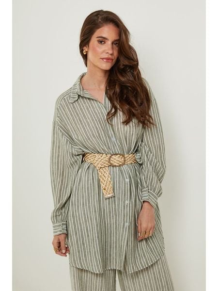 – czysty len- kołnierz: kent- zapięcie: listwa guzikowa- zakończenie rękawów: guzik- dolny brzeg: zaokrąglony- krój: oversized- wzór: paskiUwaga: Przesyłka nie zawiera paska.