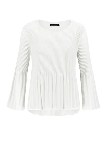 – dekolt: okrągły- krój rękawów: rozszerzany do dołu- detale: plisy- krój: prosty- look: jednokolorowy