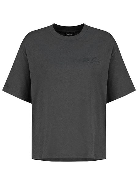 – z dodatkiem bawełny- dekolt: okrągły- długość rękawa: półdługi- dolny brzeg: z rozcięciem- krój: oversized- nadruk: w formie napisu- look: jednokolorowy