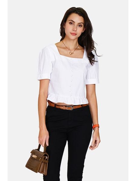 – czysta bawełna- dekolt: karo- rękaw: bufiasty – partia pleców: marszczona- dolny brzeg: z falbankami – detale: ozdobny guzik- krój: cropped- look: jednokolorowyWskazówka: Na metkach odzieży tej marki znajdują się rozmiary francuskie. Rozmiarówka została przez nas przeliczona. Podane do wyboru warianty rozmiarów odpowiadają standardowym europejskim rozmiarom konfekcji. Prosimy zapoznać się z zamieszczonym objaśnieniem rozmiarów: