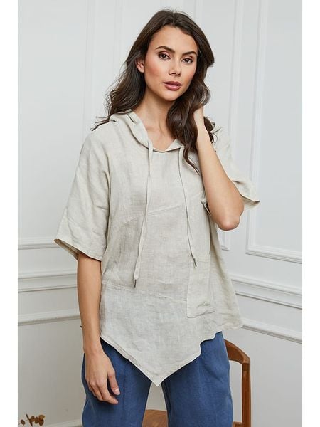 – czysty len- kaptur: ze ściągaczem tunelowym- dekolt: V- długość rękawa: półdługi- krój: prosty- look: jednokolorowy