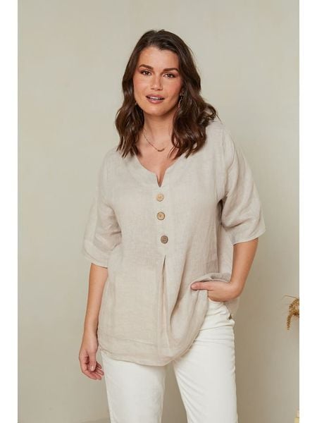 – czysty len- dekolt: z rozcięciem- zapięcie: skrócona listwa guzikowa- krój: luźny- look: jednokolorowyWskazówka: Na metkach odzieży tej marki znajdują się rozmiary francuskie. Rozmiarówka została przez nas przeliczona. Podane do wyboru warianty rozmiarów odpowiadają standardowym europejskim rozmiarom konfekcji. Prosimy zapoznać się z zamieszczonym objaśnieniem rozmiarów: