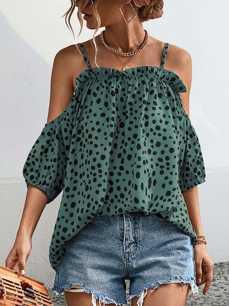 – ramiączka: regulowane- dekolt: Carmen- rękaw: bufiasty- zakończenie rękawów: elastyczne- długość rękawa: 3/4- krój: luźny- wzór: na całości