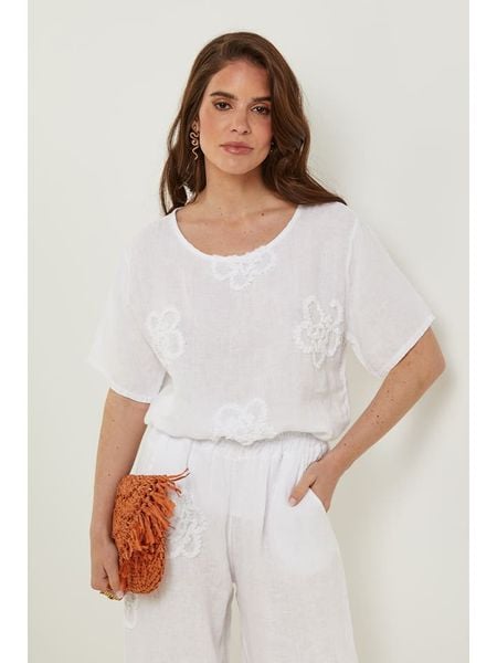 – czysty len- dekolt: okrągły- detale: haft- krój: luźny- look: jednokolorowy