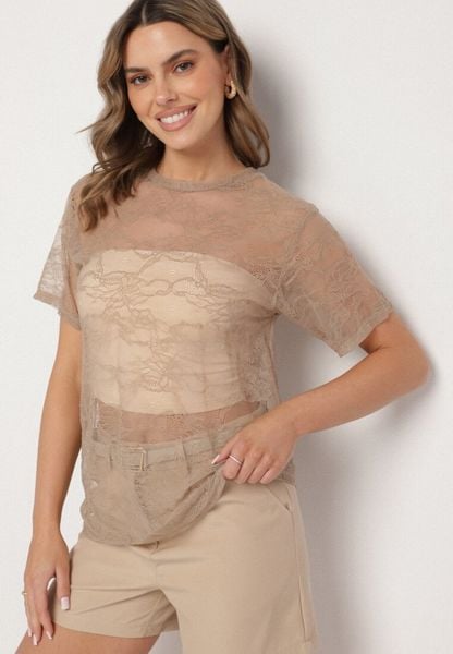 Beżowa Koronkowa Bluzka Prześwitująca z Wiskozą Liosaine