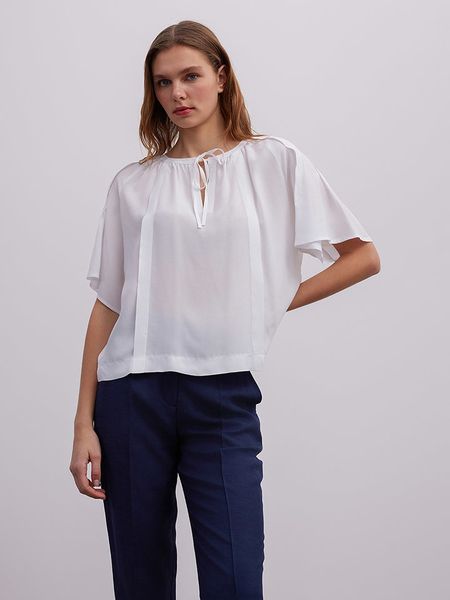 – czysta wiskoza- dekolt: okrągły- krój rękawów: motylek- detale: ozdobne wiązanie- krój: luźny- look: jednokolorowyUwaga: Przy wyborze właściwego wariantu zaleca się korzystanie z tabeli rozmiarów.