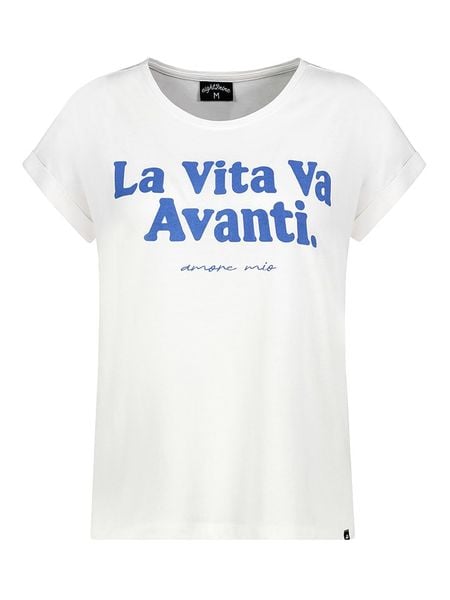 – dekolt: okrągły- krój rękawów: motylek- zakończenie rękawa: podwijane- krój: prosty- nadruk: w formie napisu- look: jednokolorowy
