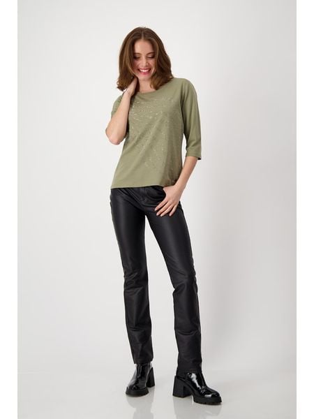 – z dodatkiem bawełny- dekolt: okrągły- długość rękawa: 3/4- detale: błyszczące kamyczki- krój: prosty- look: jednokolorowy