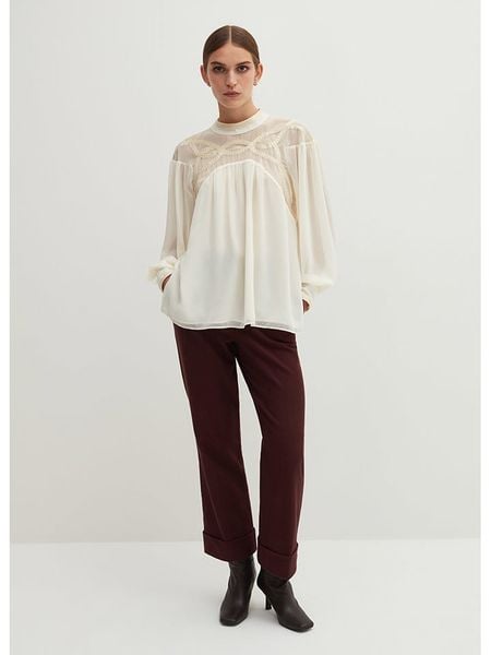 – dekolt: okrągły- zapięcie: guziki na plecach- rękaw: bufiasty- zakończenie rękawów: guziki- krój: luźny- look: jednokolorowy- wykończenie: delikatnie prześwitujące