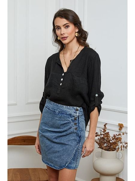 – czysty len- dekolt: z rozcięciem- zapięcie: skrócona listwa guzikowa- zakończenie rękawów: patka i guzik- krój: prosty- look: jednokolorowy