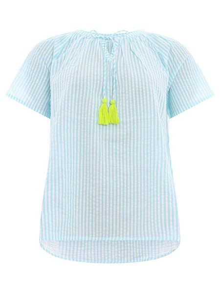 – czysta bawełna- dekolt: okrągły- detale: ozdobne wiązanie- krój: dłuższe plecy- wzór: paski
