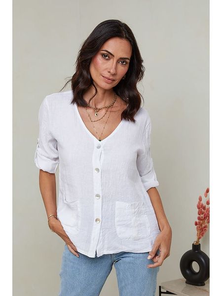 – czysty len- dekolt: V- zapięcie: listwa guzikowa- długość rękawa: półdługi- zakończenie rękawów: patka i guzik- kieszenie: naszyte- krój: prosty- look: jednokolorowyUwaga: Na metkach odzieży tej marki znajdują się rozmiary francuskie. Rozmiarówka została przez nas przeliczona. Podane do wyboru warianty rozmiarów odpowiadają standardowym europejskim rozmiarom konfekcji. Prosimy zapoznać się z zamieszczonym objaśnieniem rozmiarów.