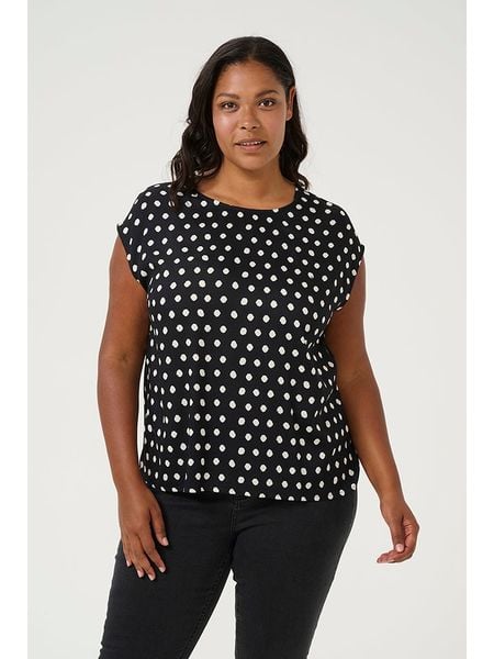 – czysta wiskoza- dekolt: okrągły- zapięcie: guzik na plecach- krój: prosty- wzór: kropki