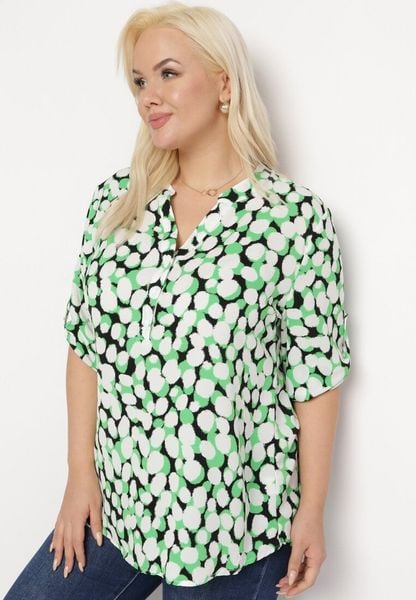 Zielono-Biała Bluzka z Trójkątnym Dekoltem w Fantazyjny Print Anola