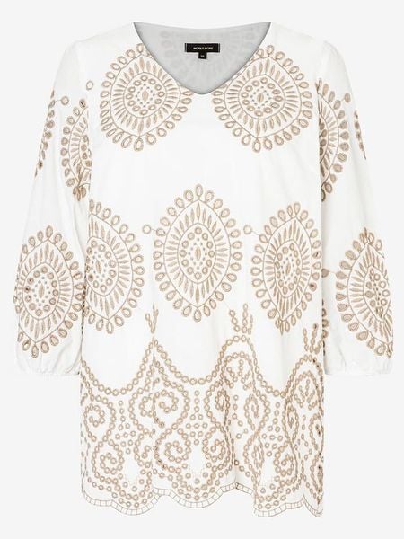 – dekolt: V- długość rękawa: 3/4- detale: haft- krój: luźny- wzór: na całości