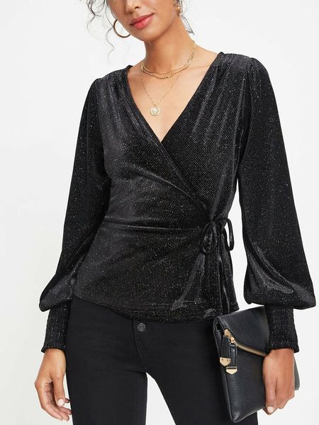 – dekolt: V- rękaw: bufiasty- zakończenie rękawów: marszczenie- detale: połyskująca nitka- krój: taliowany- look: jednokolorowyUwaga: Przy wyborze właściwego wariantu zaleca się korzystanie z tabeli rozmiarów.