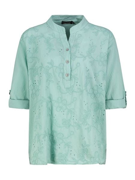 – czysta bawełna- kołnierz: stójka- zapięcie: skrócona listwa guzikowa- zakończenie rękawów: patka i guzik- długość rękawa: półdługi- detale: haft, ozdobna zakładka- krój: prosty- look: jednokolorowy