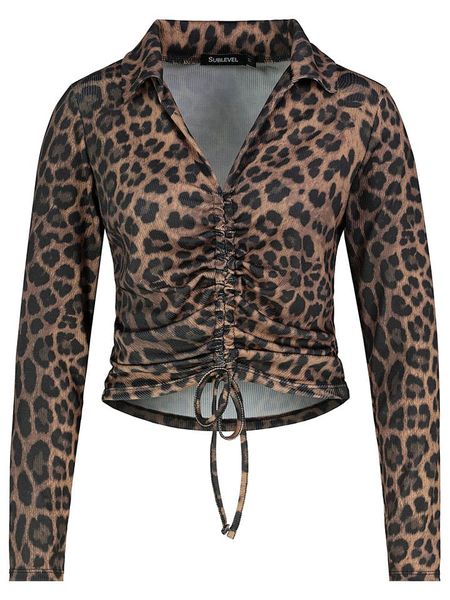 – kołnierz: kent- dekolt: V- zapięcie: wiązane tasiemki- krój: cropped- wzór: panterka