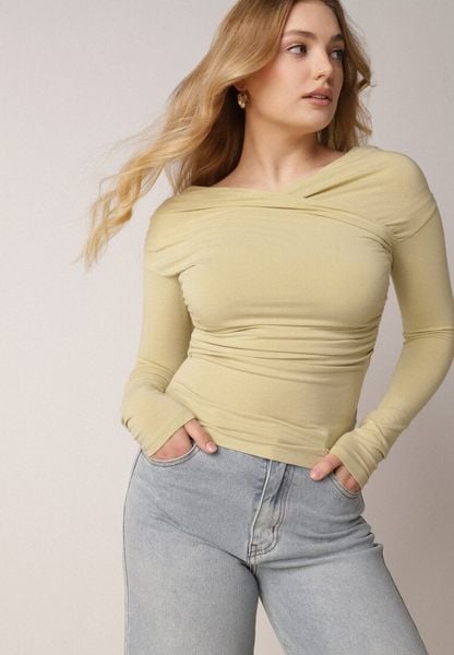 Zielona Bluzka z Bawełną Dekoltem Typu Łódka i Marszczeniem Typhatos