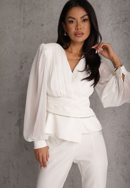 Biała Bluzka VICES w Kopertowym Stylu z Luźnymi Transparentnymi Rękawami i Dekoltem V Inge