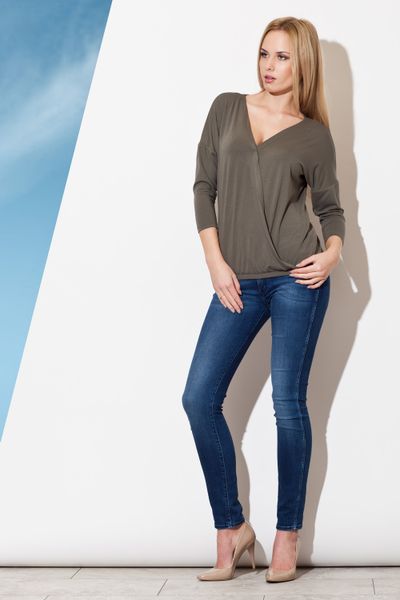 Oliwkowa Zbluzowana Bluzka z Długim Rękawem