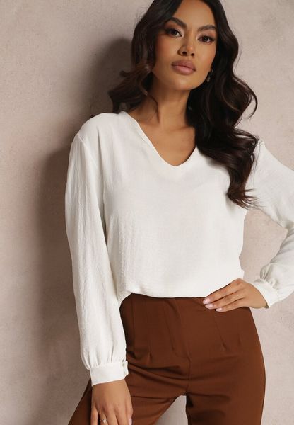 Bluzka Phaedreda o basicowym, ponadczasowym fasonie. Wykonana z gładkiej tkaniny. Z głębokim dekoltem w kształcie litery „V” oraz długim rękawem wykończonym makietami. Możesz połączyć ją z ulubionymi jeansami, spódniczką mini lub szortami. Idealna do kapsułowej garderoby.