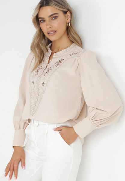 Bluzka Nardos zapinana z przodu na rząd guzików przy dekolcie. Wykonana z gładkiej tkaniny, dekorowana stylowym haftem. Luźne rękawy zakończone mankietami na guziki. Klasyczny, zaokrąglony dekolt.