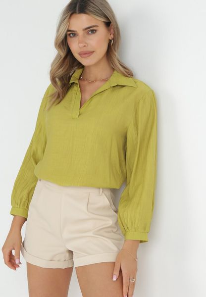 Jasnozielona Rozszerzana Bluzka z Kołnierzem i Długim Rękawem Zandia