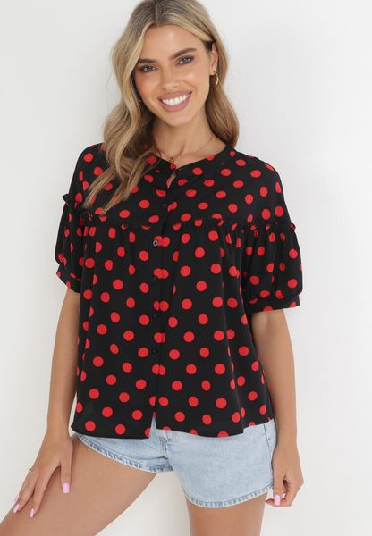 Czarna Rozkloszowana Bluzka w Kropki z Falbanką Eblia
