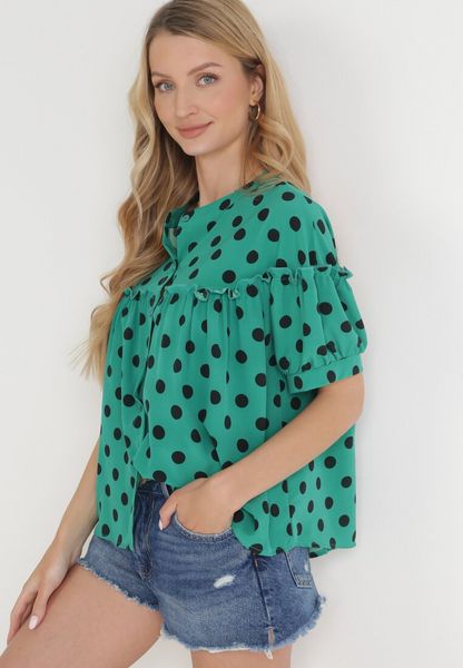 Zielona Rozkloszowana Bluzka w Kropki z Falbanką Eblia