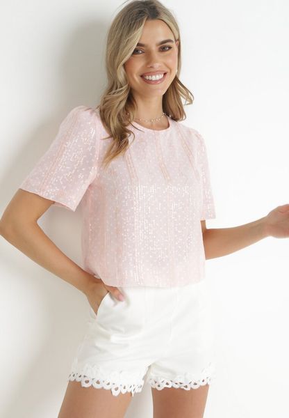 Różowa Bluzka Haftowana z Cekinami i Krótkim Rękawem Theresit