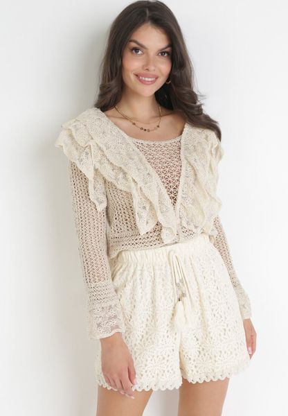 Beżowa Bawełniana Bluzka z Szydełkowej Tkaniny z Falbankami Wihalla