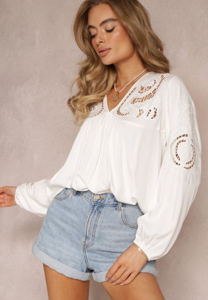 Biała Bluzka Wiązana na Plecach z Ażurowym Haftem z Wiskozy Conleia