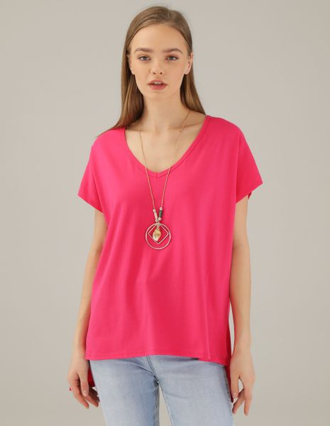 Różowa bluzka wykonana z miękkiej i cienkiej bawełny z domieszką elastanu. – dekolt w kształcie litery V – krótkie rękawy – naszyjnik w komplecie – wydłużony tył – rozporki po bokach – swobodny fason Wymiary bluzki [cm]: S M &l