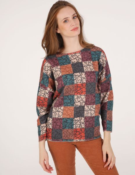Bluzka wykonana z przyjemnej w dotyku dzianiny z dodatkiem wełny. – dekolt w łódkę– długie rękawy z obniżoną linią ramion– oryginalny wzór w kwadraty– swobodny fason Wymiary dla rozmiaru S: Długość całkowita: 67 cm Szerokość w biuście: 65 cm Modelka ma 176 cm wzrostu i prezentuje rozmiar S. Podane wymiary mają charakter orientacyjny.
