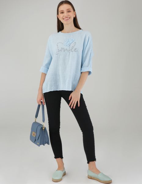 Bluzka wykonana z wysokogatunkowej bawełny. – zaokrąglony dekolt– rękawy 3/4– ozdobna aplikacja z cekinów– swobodny fason Wymiary dla rozmiaru S: Długość całkowita: 61 cm Szerokość w biuście: 57 cm Modelka ma 174 cm wzrostu i prezentuje rozmiar S. Podane wymiary mają charakter orientacyjny.