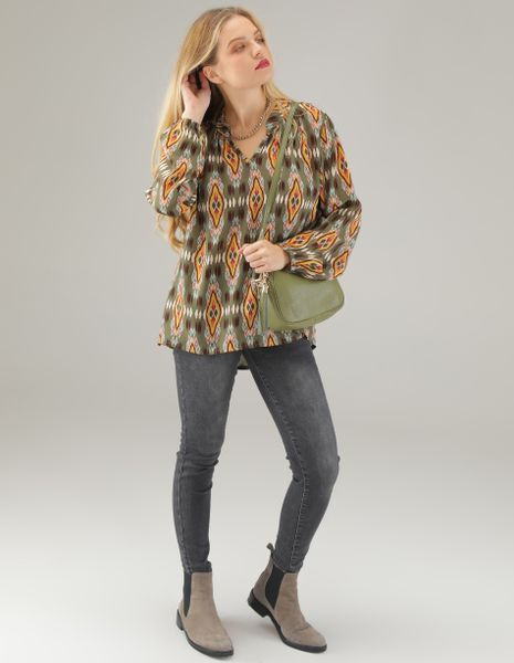 Bluzka wykonana z przewiewnej wiskozy. – stójka z pęknięciem– długie rękawy zakończone gumką– swobodny fason– oryginalny wzór Wymiary dla rozmiaru uniwersalnego: Długość całkowita: 70 cm Szerokość w biuście: 59 cm Modelka ma 171 cm wzrostu i prezentuje rozmiar uniwersalny. Podane wymiary są mierzone na płasko i mają charakter orientacyjny.