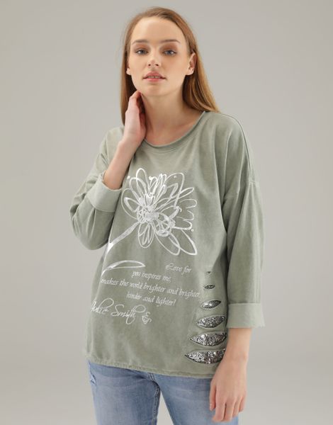 Luźna bluzka wykonana z przyjemnego w dotyku materiału. – okrągły dekolt z surowym zakończeniem– obniżona linia przeszycia ramion– długie rękawy– z przodu duży nadruk– postrzępienia z przezroczystą koronką z cekinami– dół z regulowanym sznurkiem– wydłużony tył Wymiary dla rozmiaru uniwersalnego: Długość całkowita (przód/tył): 65/71 cm Szerokość w biuście: 63 cm Modelka ma 175 cm wzrostu […]