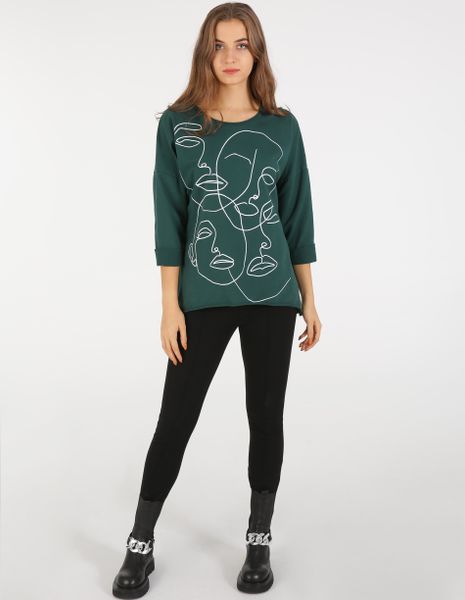 Zielona bluzka z oryginalnym nadrukiem. – zaokrąglony dekolt– obniżona linia ramion– tył lekko wydłużony– luźny fason Wymiary dla rozmiaru S: Długość całkowita: 75 cm Szerokość w biuście: 55 cm Modelka ma 180 cm wzrostu i prezentuje rozmiar S. Podane wymiary mają charakter orientacyjny.