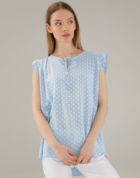 Niebieska bluzka z charakterystycznym nadrukiem. – zaokrąglony dekolt – pęknięcie z wiązaniem – krótkie rękawy z falbaną – wydłużony tył Wymiary bluzki [cm]: S M L Długość całkowita (przód/tył): 64/72 66/74 68/75 Szerokość w biuście: 57 59 61 Modelka ma 175 cm wzrostu i prezentuje rozmiar S. Podane wymiary są mierzone na płasko i […]