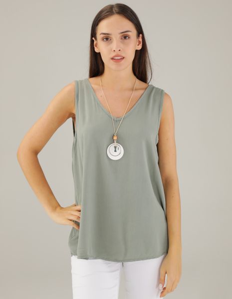 Bluzka wykonana z przewiewnej tkaniny z wiskozy. – dekolt w serek– szerokie ramiączka– naszyjnik w komplecie– krótszy, swobodny fason Wymiary dla rozmiaru uniwersalnego: Długość całkowita: 68 cm Szerokość w biuście: 51 cm Modelka ma 176 cm wzrostu i prezentuje rozmiar uniwersalny. Podane wymiary są mierzone na płasko i mają charakter orientacyjny.