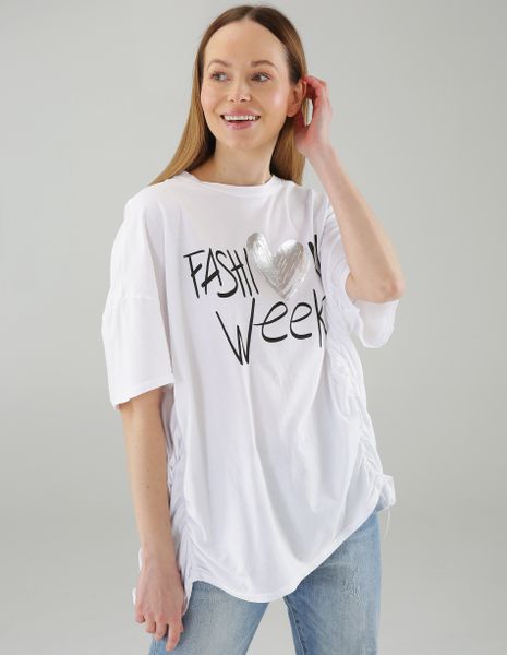 Bluzka wykonana z miękkiej bawełny. – okrągły dekolt– krótkie rękawy– ozdobny, mieniący się nadruk– efektowne ściągacze z przodu– delikatnie wydłużony tył– swobodny fason Wymiary dla rozmiaru S/M: Długość całkowita (przód/tył): 70/80 cm Szerokość w biuście: 67 cm Modelka ma 180 cm wzrostu i prezentuje rozmiar S/M. Podane wymiary mają charakter orientacyjny.