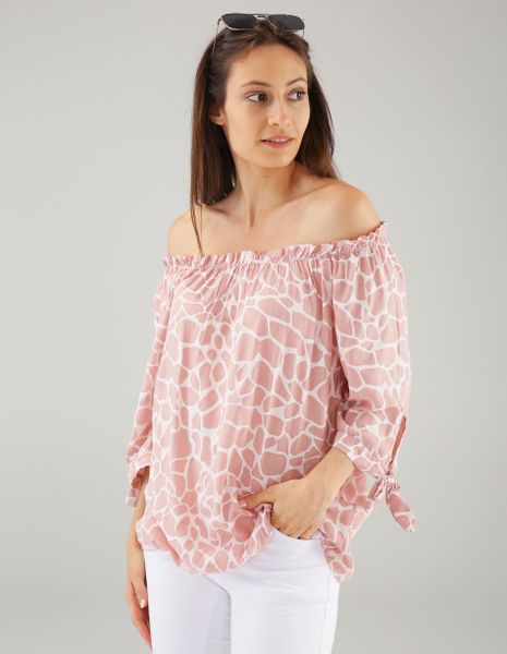 Bluzka wykonana z przewiewnej wiskozy. – dekolt typu hiszpanka z wszytą gumką– rękawy 3/4 zakończone wiązaniem– swobodny fason– zwierzęcy motyw Wymiary bluzki [cm]: S/M L/XL Długość całkowita: 64 67 Szerokość w biuście: 50 56 Modelka ma 173 cm wzrostu i prezentuje rozmiar S/M. Podane wymiary są mierzone na płasko mają charakter orientacyjny.