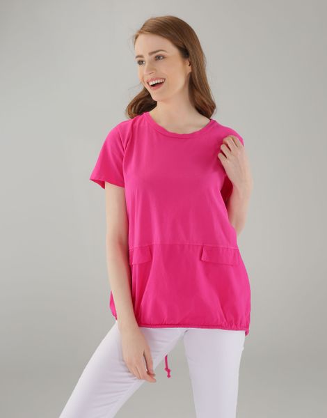 Bluzka wykonana z gładkiej bawełny. – zaokrąglony dekolt– krótkie rękawy– na wysokości pasa atrapy kieszeni– dół z wszytym troczkiem Wymiary dla rozmiaru S/M: Długość całkowita: 67 cm Szerokość w biuście: 54 cm Modelka ma 174 cm wzrostu i prezentuje rozmiar S/M. Podane wymiary mają charakter orientacyjny.