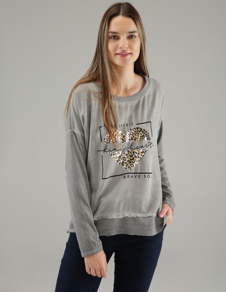Szara bluzka wykonana z cienkiej tkaniny na bazie wiskozy oraz bawełny. – zaokrąglony dekolt – długie rękawy – nadruk z przodu – brzegi zakończone prążkowanym, mieniącym się ściągaczem – poziome przeszycie z surowym wykończeniem – wydłużony tył Wymiary bluzki [cm]: S M L Długość całkowita (przód/tył): 63/71 65/71 66/73