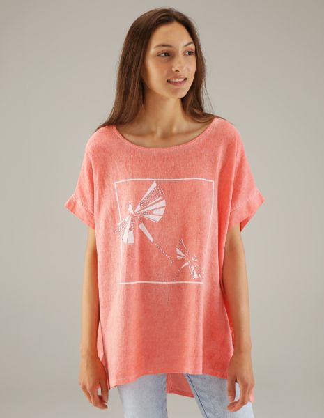 Bluzka wykonana z łączonych materiałów. – zaokrąglony dekolt– krótkie rękawy– na przodzie nadruk z cekinami– po bokach pęknięcia– wydłużony tył Wymiary dla rozmiaru S: Długość całkowita (przód/tył): 68/77 cm Szerokość w biuście: 62 cm Modelka ma 176 cm wzrostu i prezentuje rozmiar S. Podane wymiary mają charakter orientacyjny.